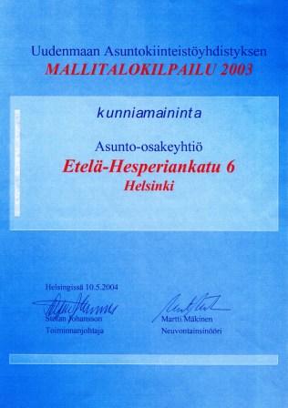 Taloyhtiö sai kunniamaininnan Uudenmaan Asuntokiinteistöyhdistyksen Mallitalokilpailussa 2003.