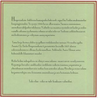 Tämä kirja kertoo yhden tyypillisen töölöläistalon tarinan 75-vuoden ajalta. Asunto Oy Etelä-Hesperiankatu 6 perustettiin keväällä 1927 alueen rakennuskuumeen ollessa korkeimmillaan. Arkkitehti Aarre Ekman antoi kulmatalolle klassistiset muodot.