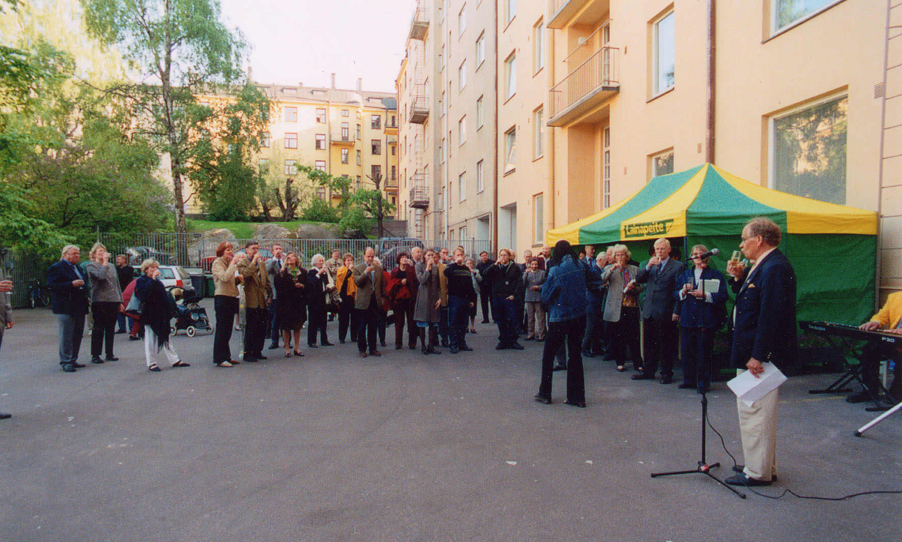 Historiikki julkistettiin talon 75-vuotisjuhlissa 27.5.2002. Kuvassa hallituksen puheenjohtaja Tuure A. Korhonen kohottaa maljan 75-vuotiaalle talolle.